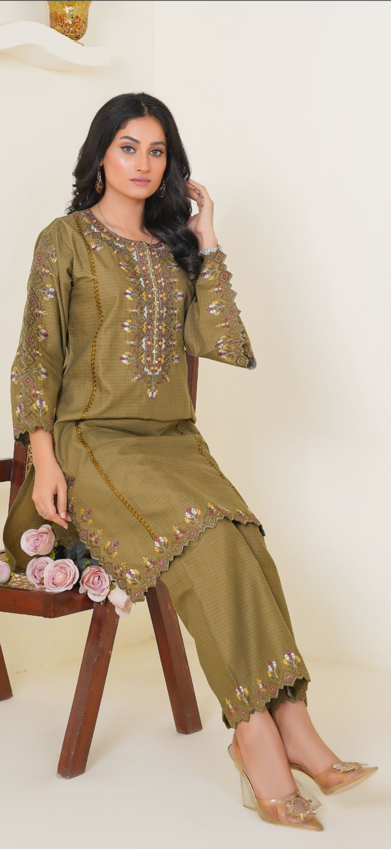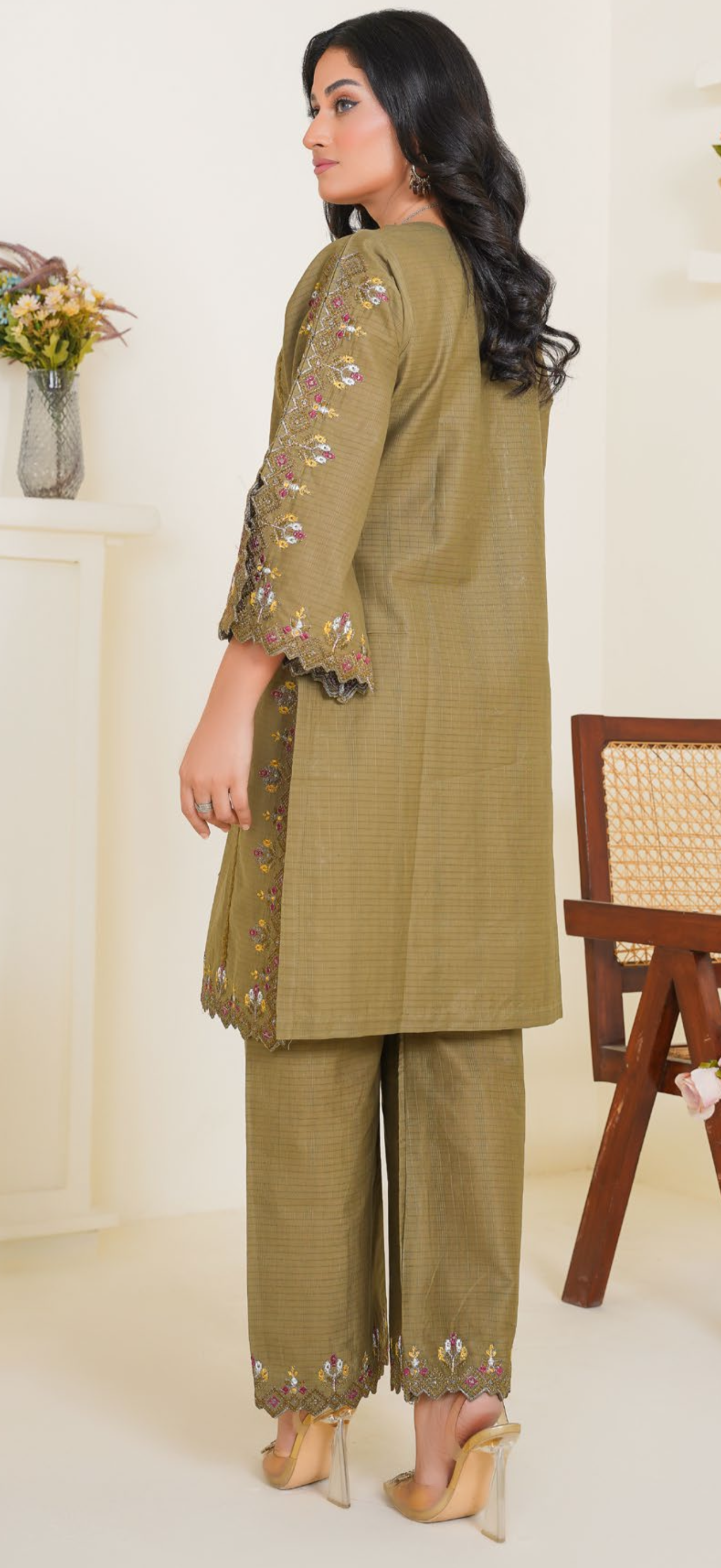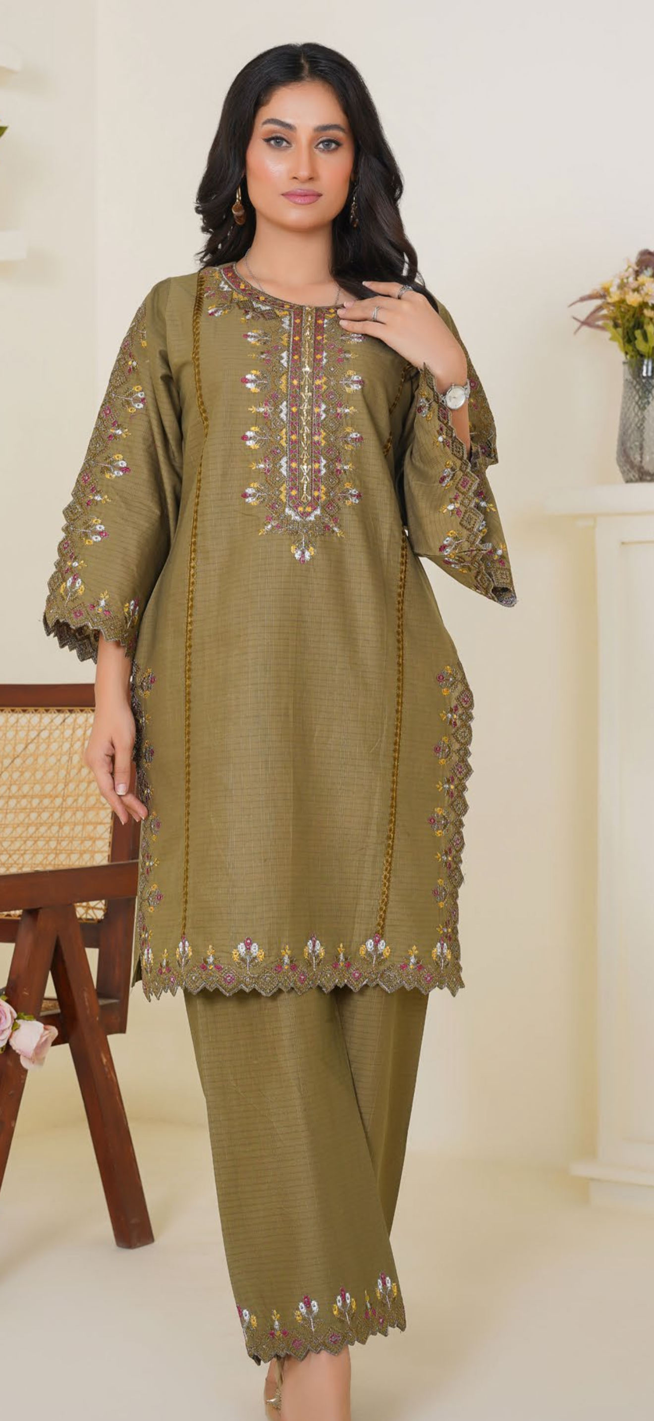 Simple and classy 2pc outfit with thread embroidery on neck line and on the trousers