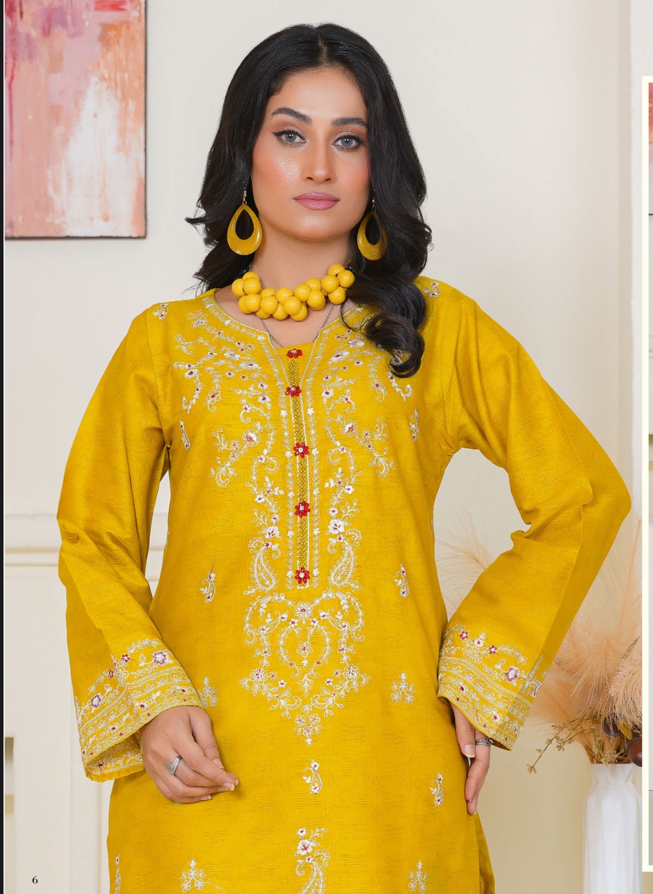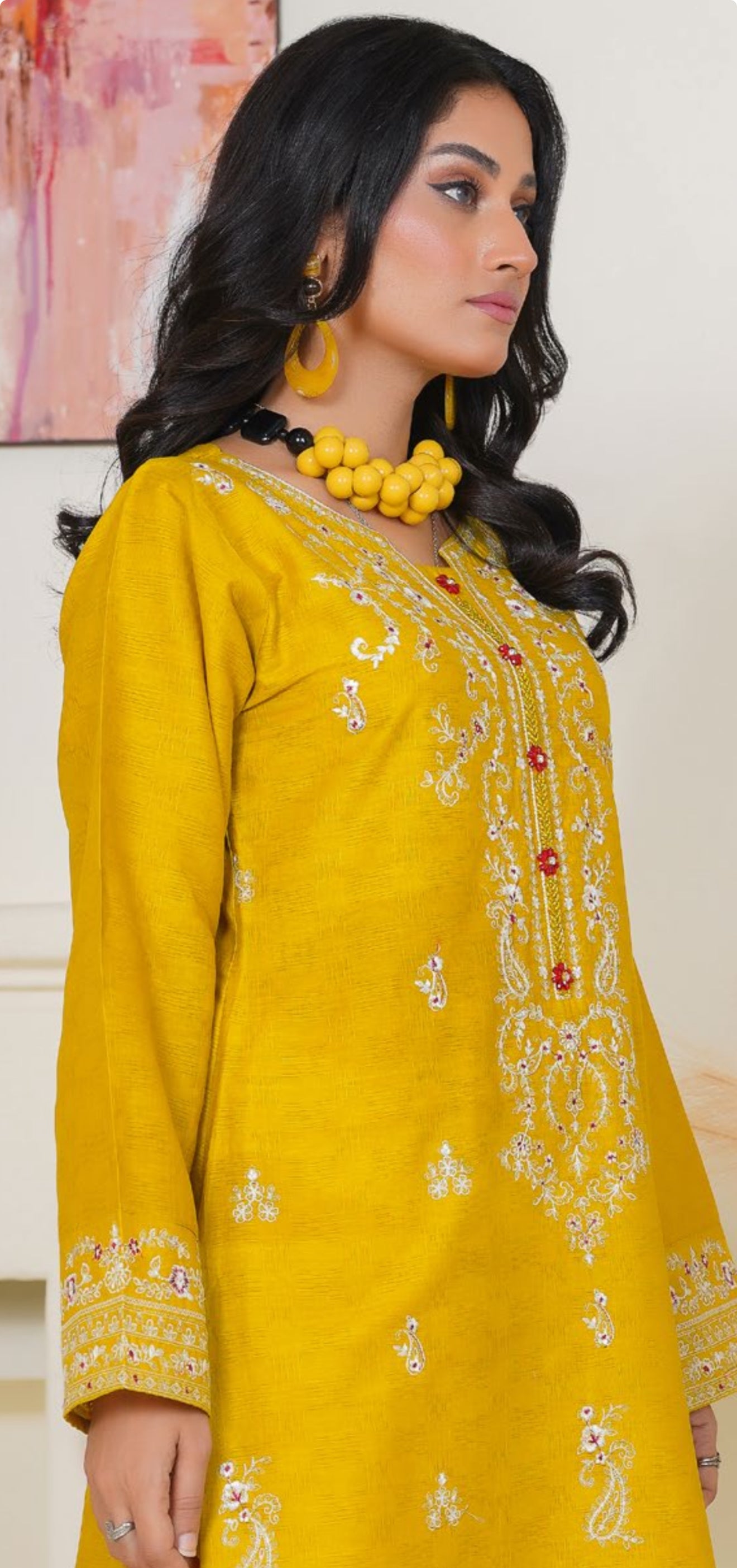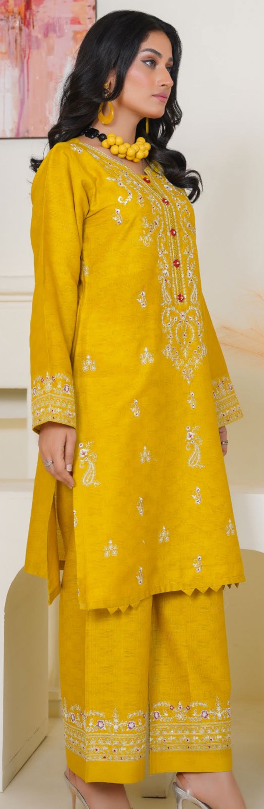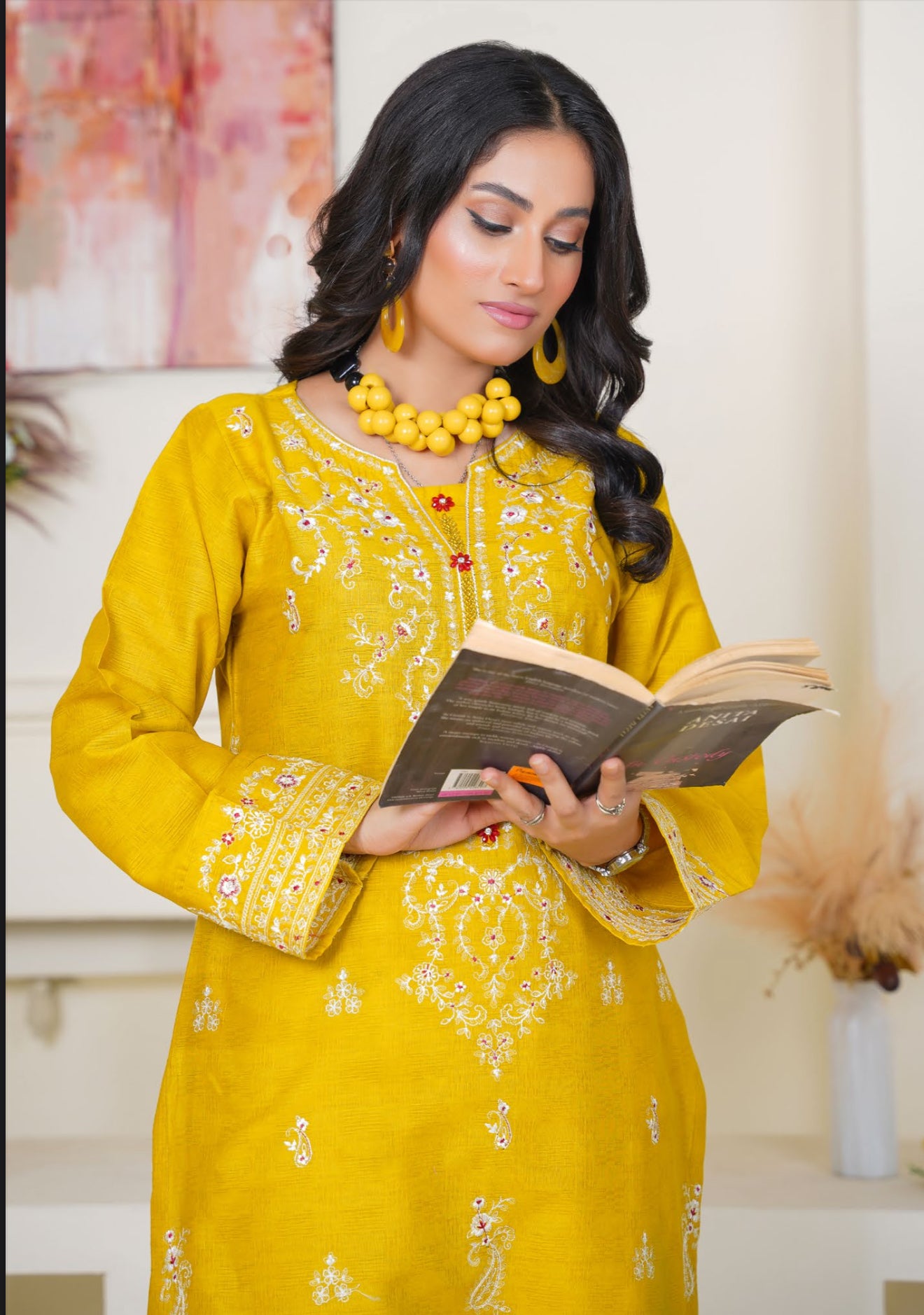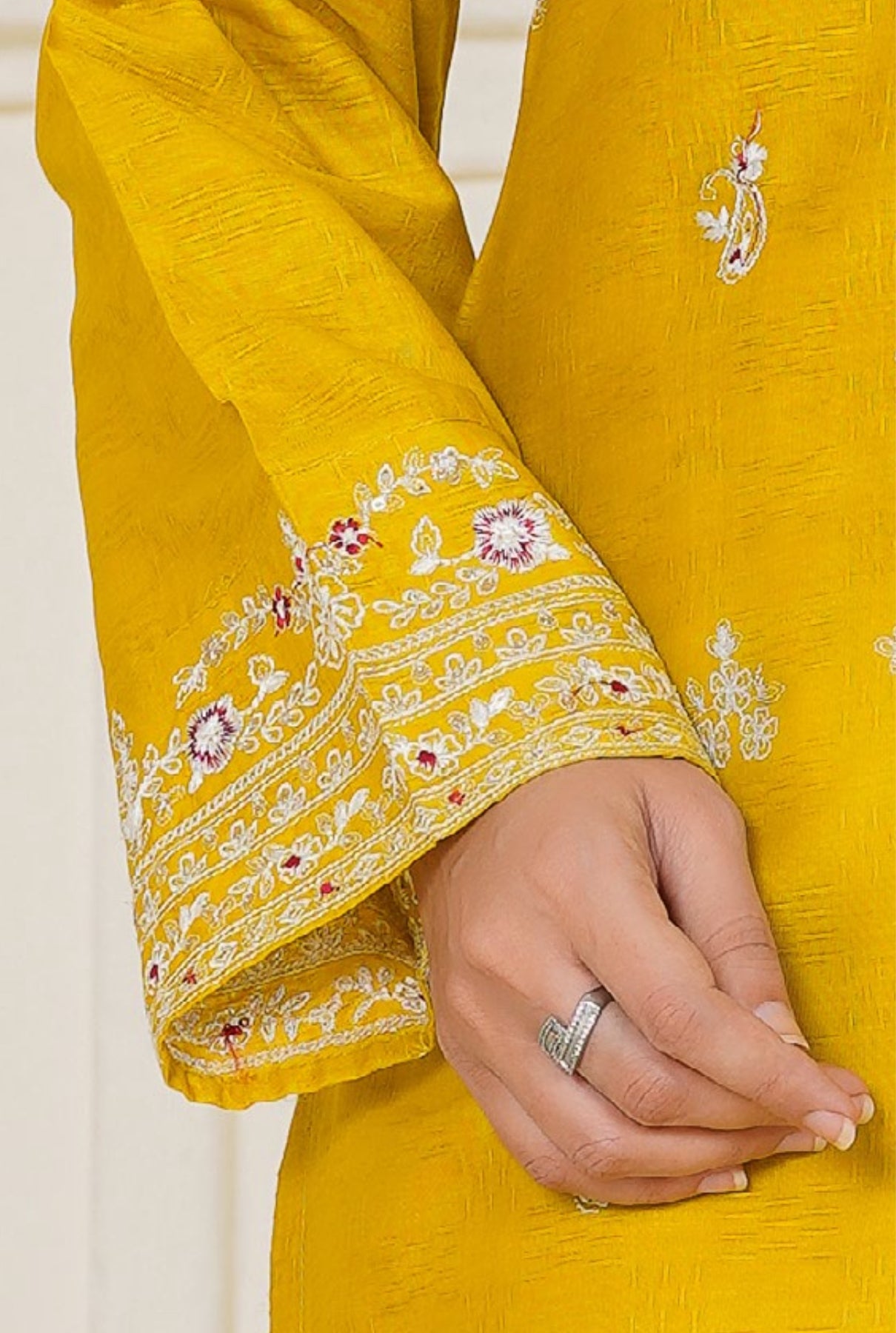 Simple and sophisticated yellow 2pc outfit with thread embroidery on kameez and on trousers