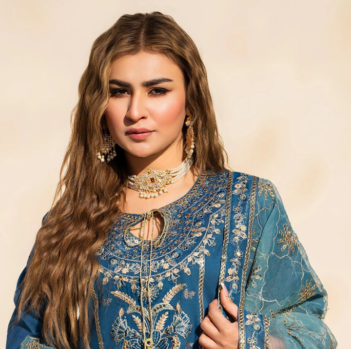 3-piece suite embroidery with organza patch, embroidery sequence dupatta, and matching farshi trouser with organza patch