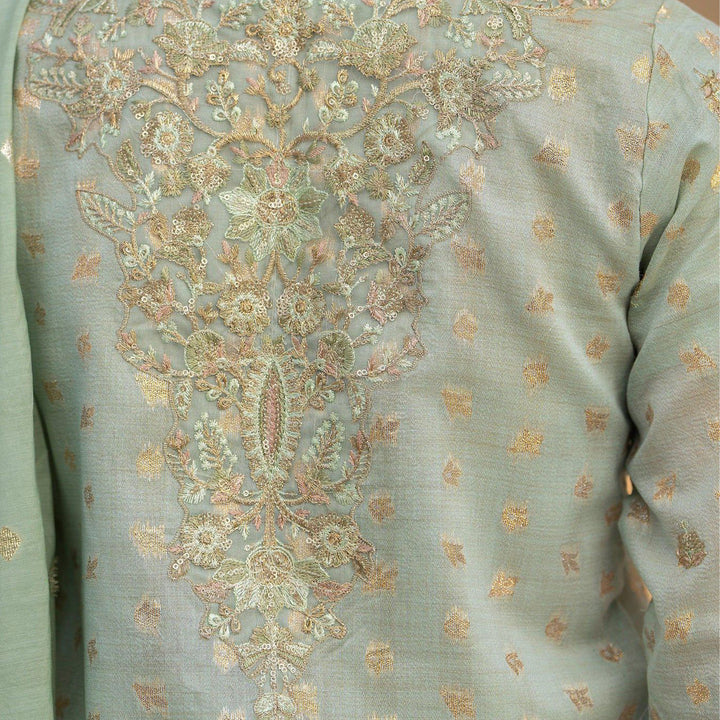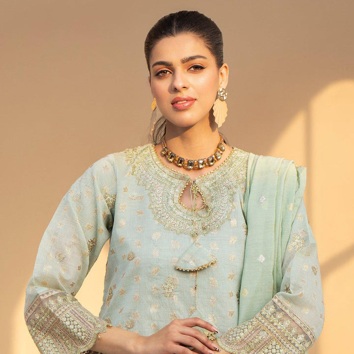 The pistachio zari fabric serve as a foundation for the fascinating shirt with front and back border necklines and front and back border patch, sleeves with embroidery motifs and border patch with tussles and chok are also made by embroidery Patti patch, with flapper viscose lace trouser and dyed dupatta of jacquard fabric.
