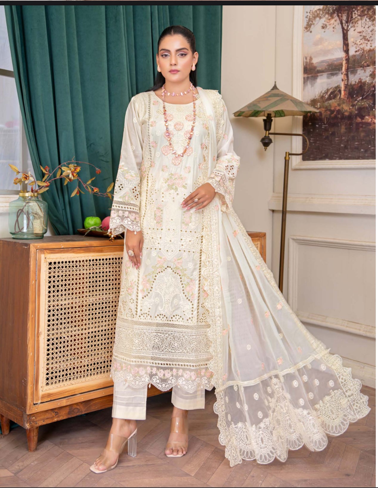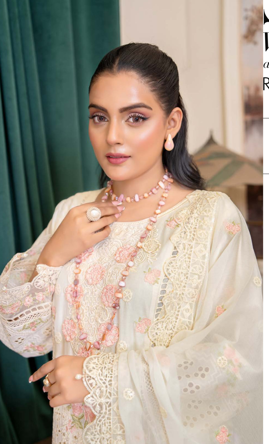Upgrade your wardrobe with our Are2 cream outfit, featuring elegant pink and gold embroidery. Perfect for evening parties and special occasions, this classic and sophisticated piece will elevate your look. Don't miss out, get it now!