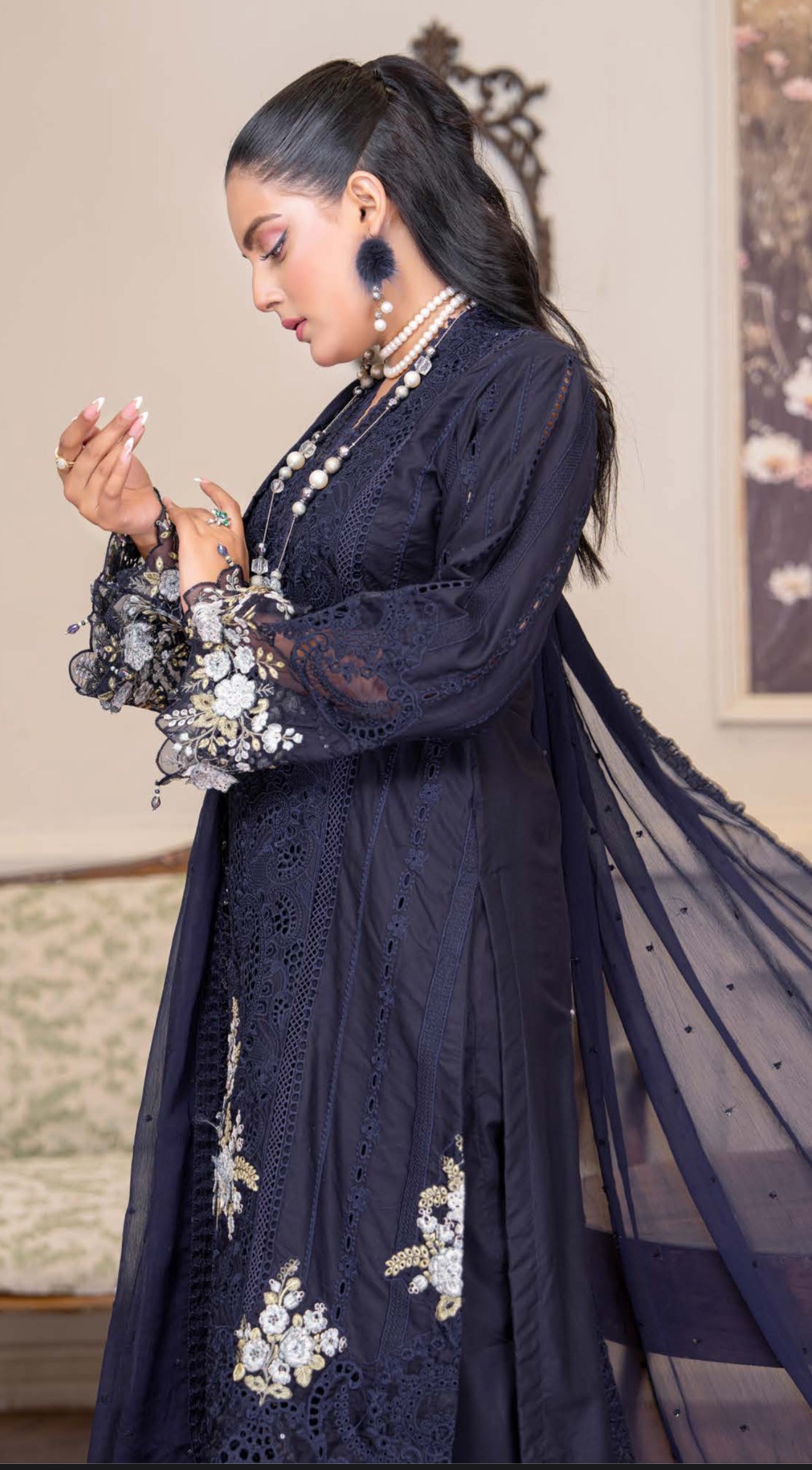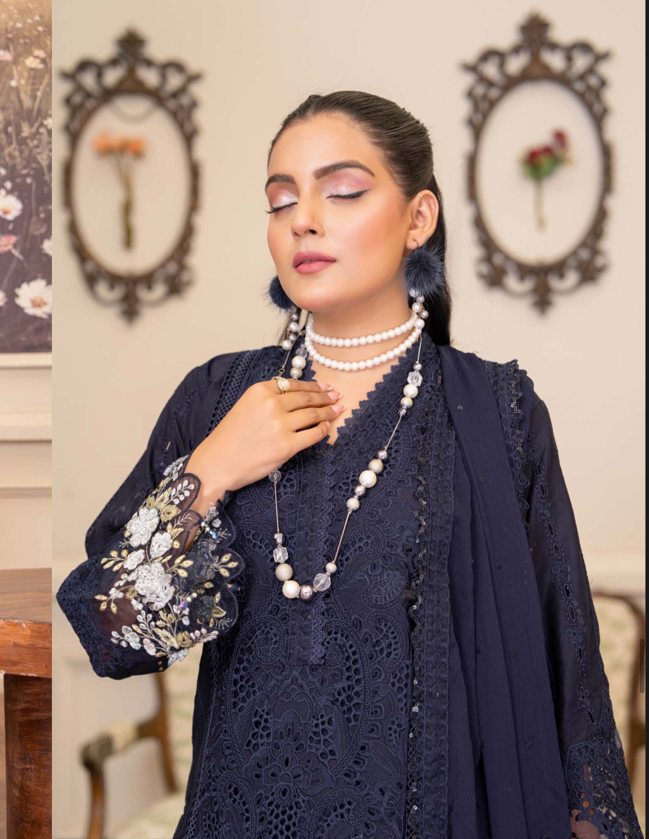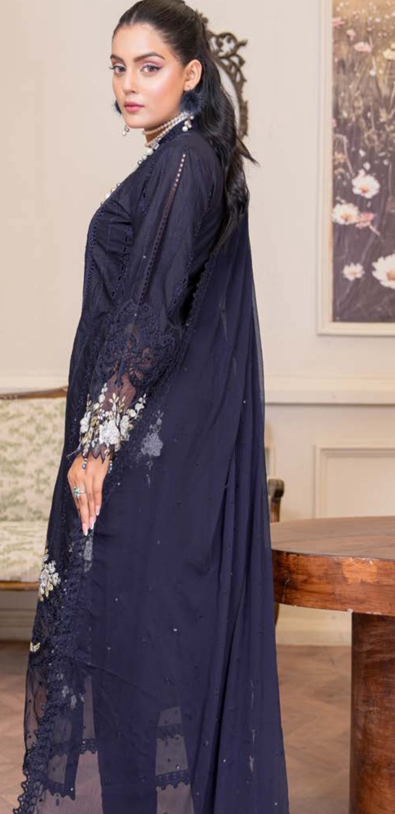 "Get ready to turn heads in this luxurious navy blue outfit. Featuring full thread red embroidery and intricate chicken kari work, this outfit is perfect for special occasions. The chiffon duppata adds a touch of elegance, with its delicate embroidery and patchwork. Stand out from the crowd with Are3 navy blue."