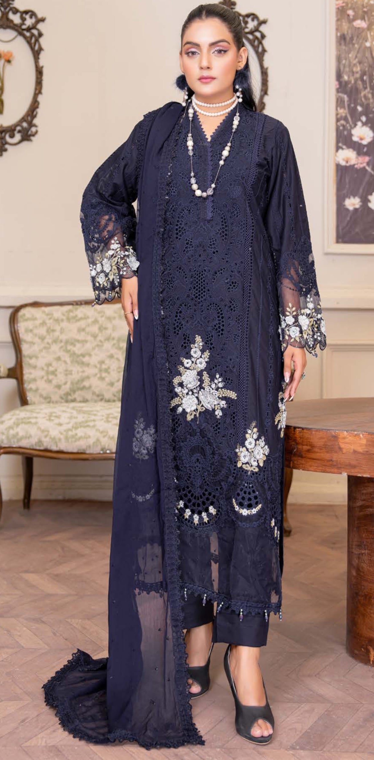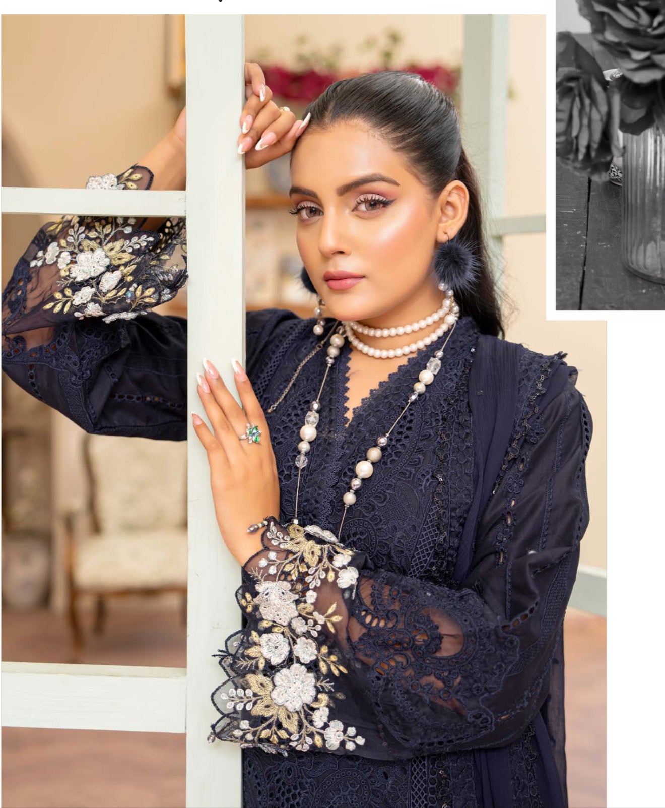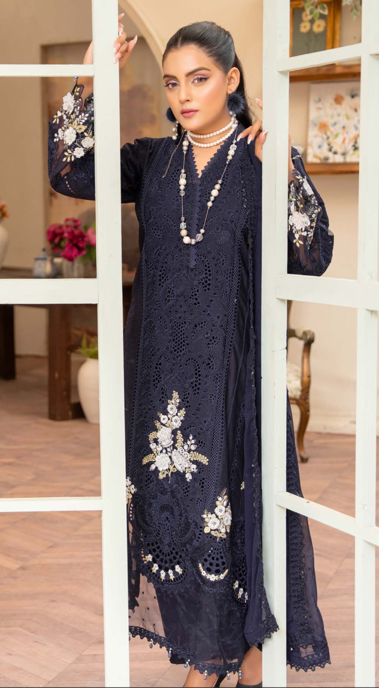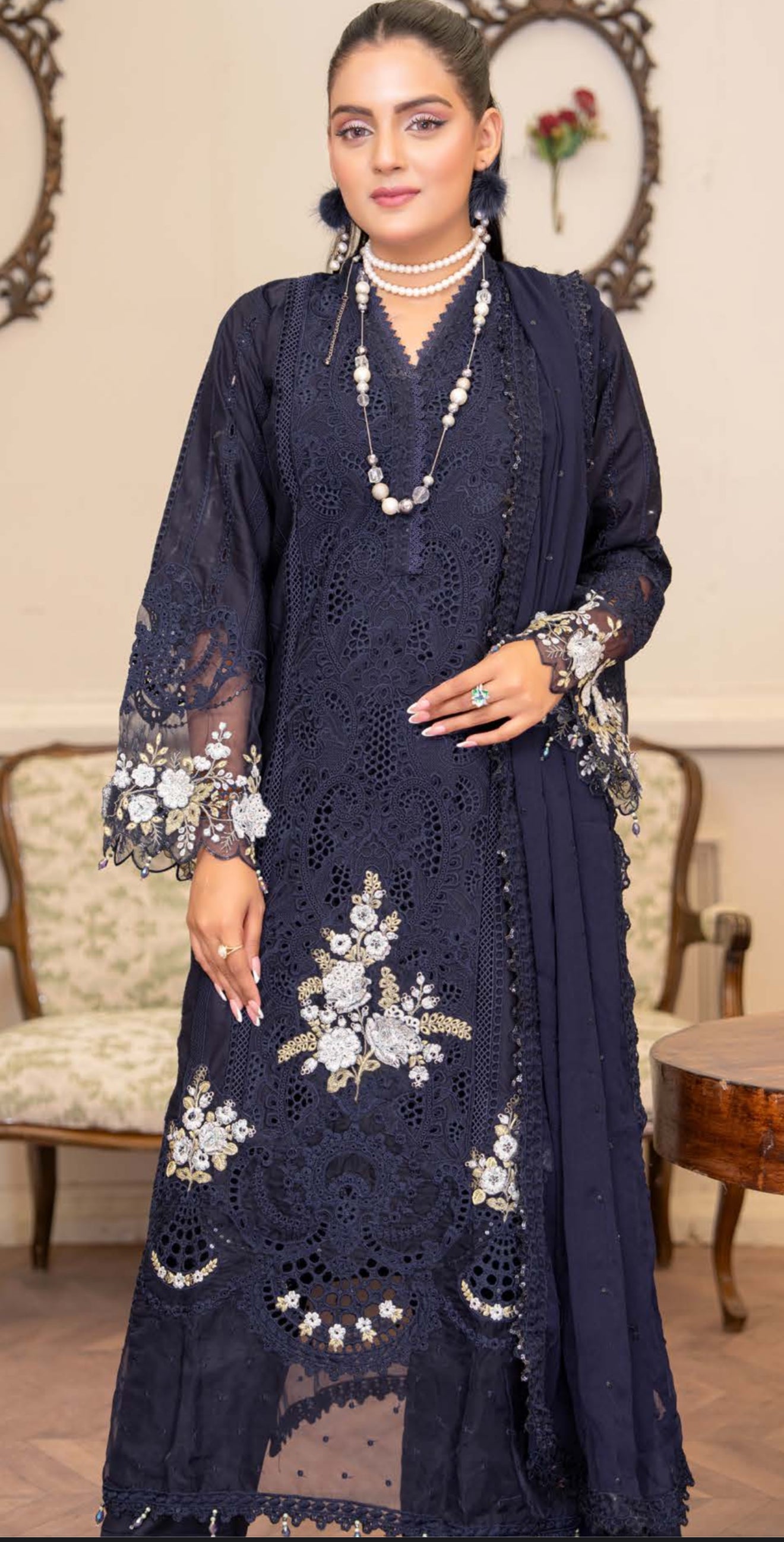 "Get ready to turn heads in this luxurious navy blue outfit. Featuring full thread red embroidery and intricate chicken kari work, this outfit is perfect for special occasions. The chiffon duppata adds a touch of elegance, with its delicate embroidery and patchwork. Stand out from the crowd with Are3 navy blue."