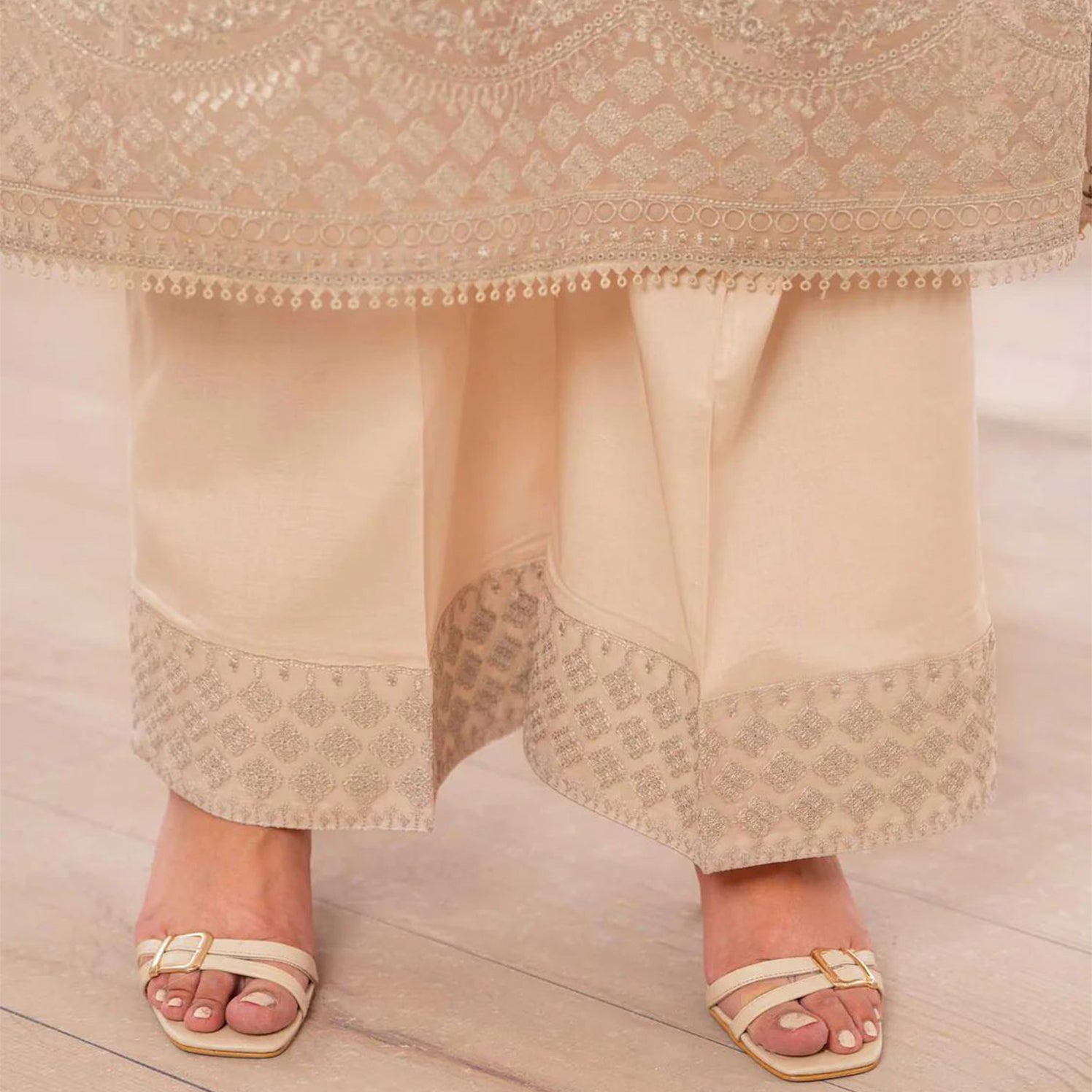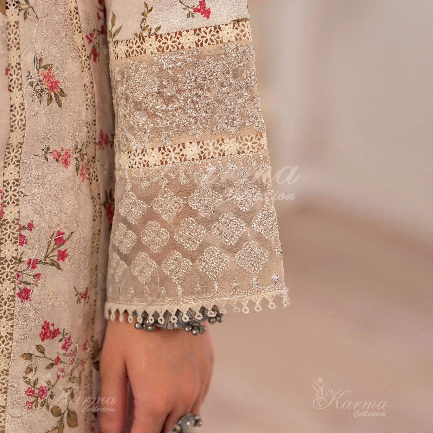 Shirt: Chikankari Shirt with Embroidered Organza Patch on Border and Lace Dupatta: Printed Khaadi Net Dupatta with Lace Trouser: Plain Trouser with Patch