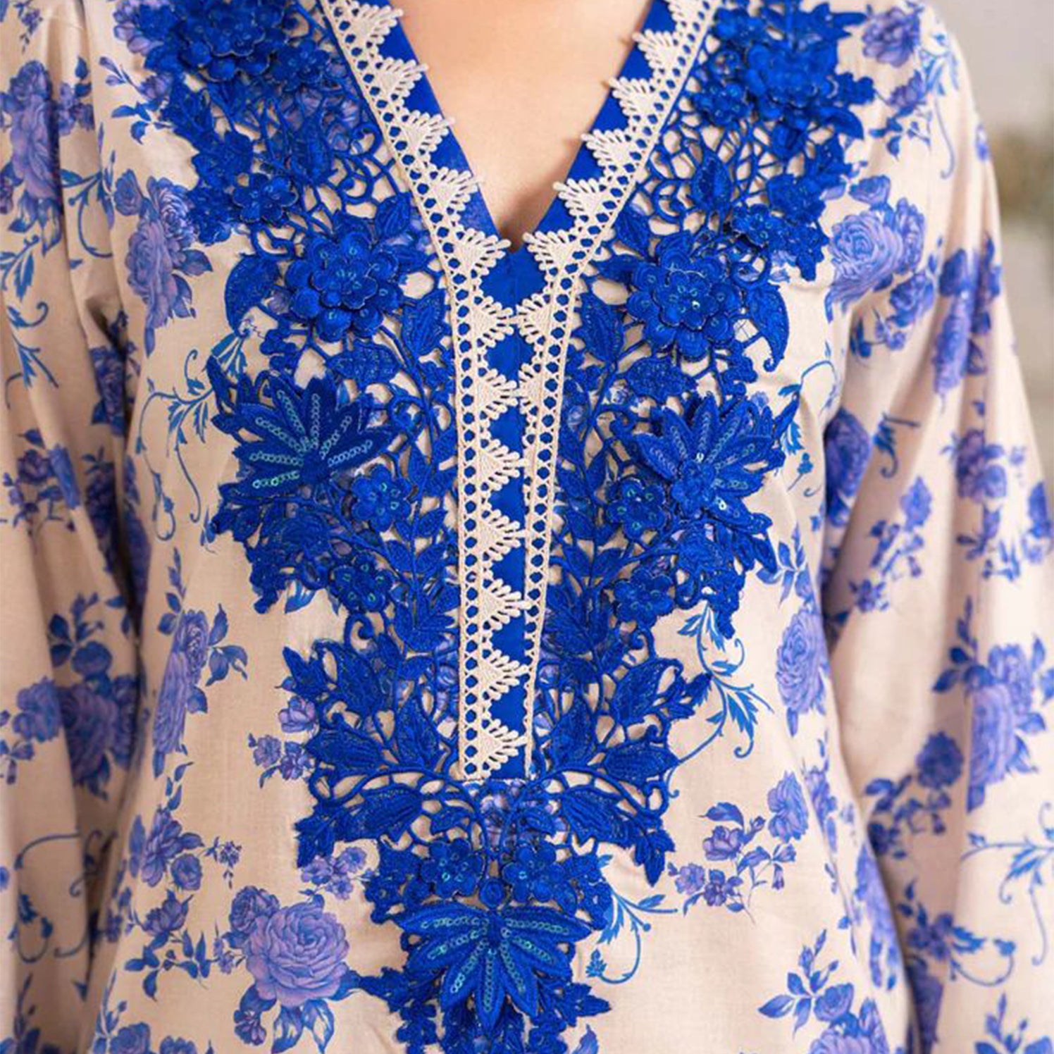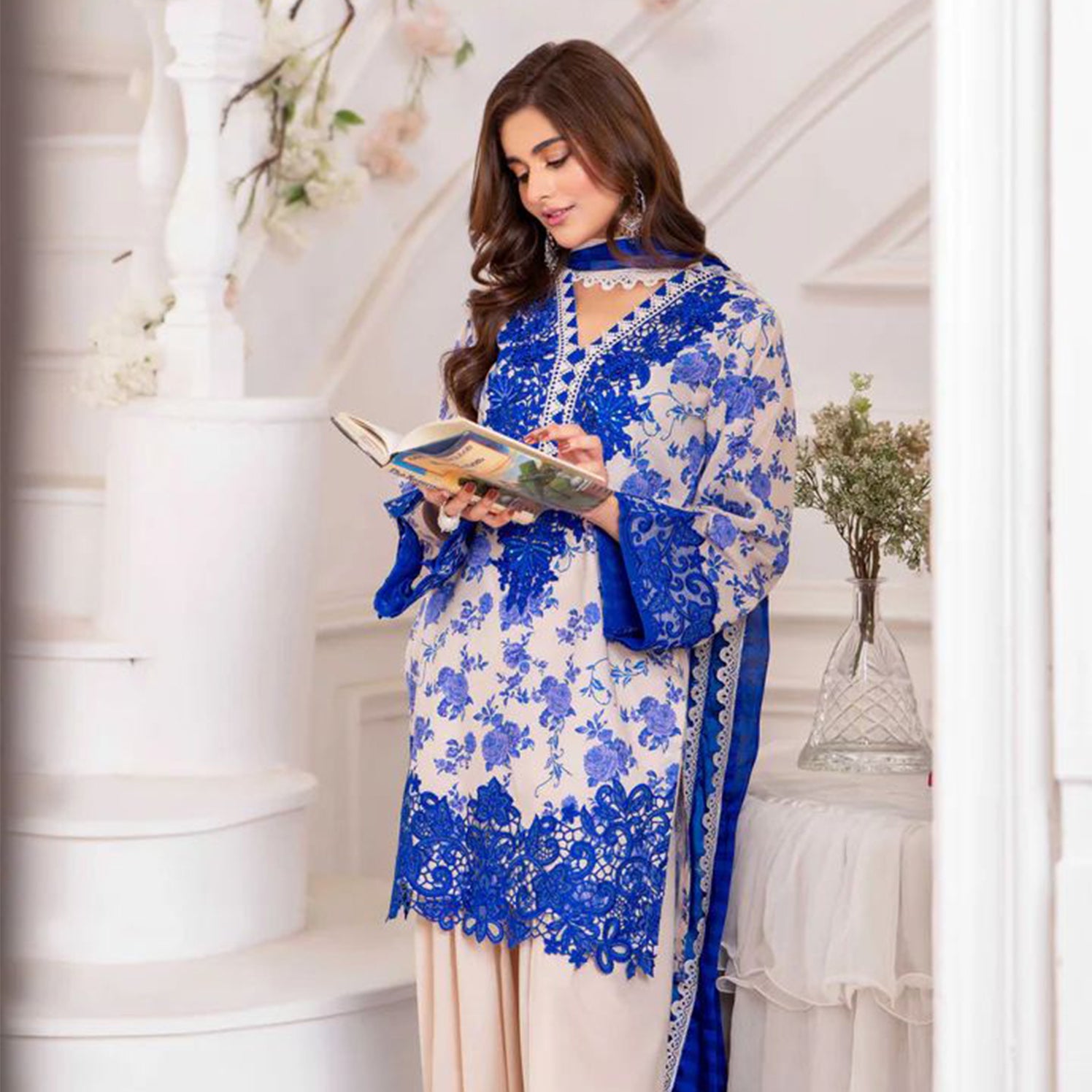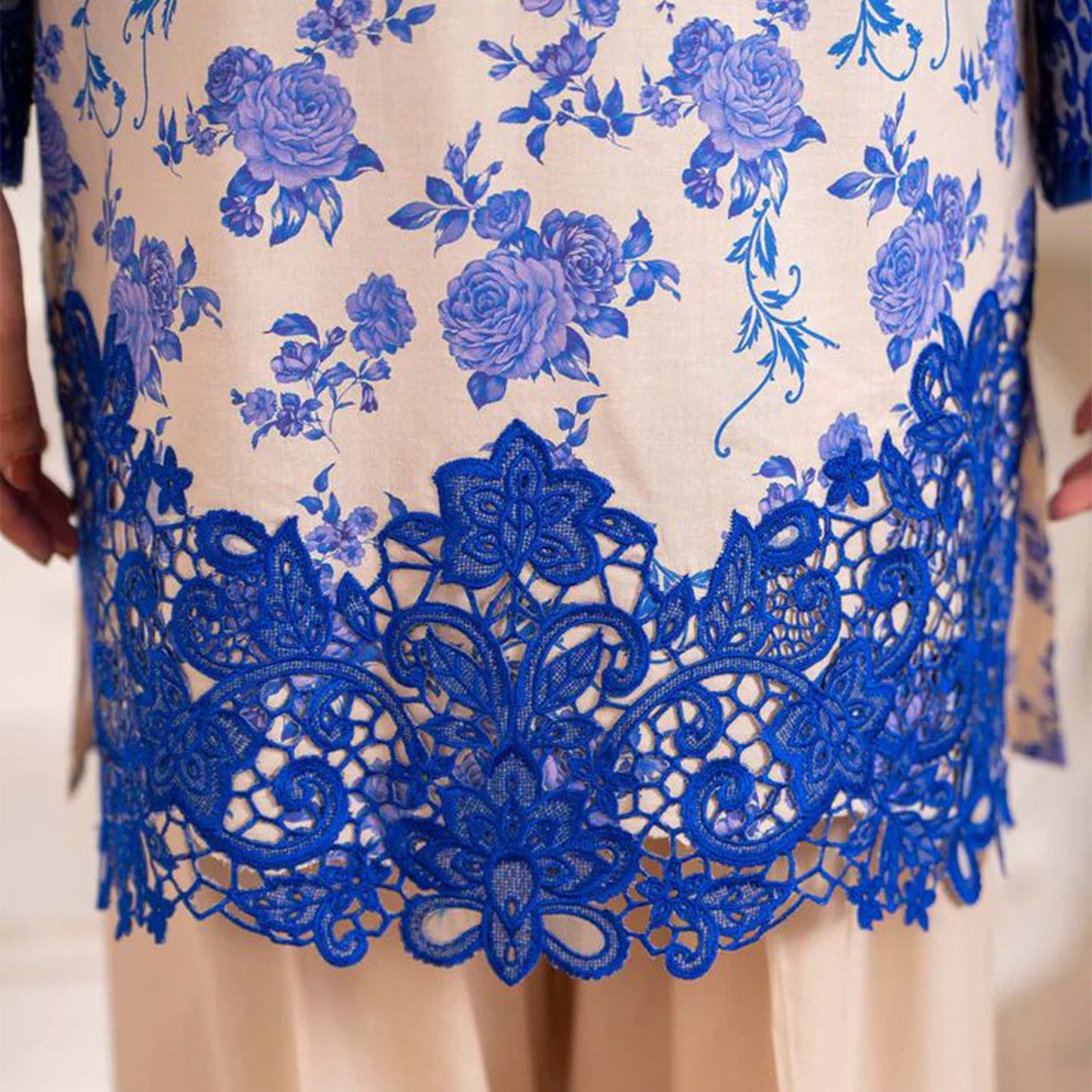 Shirt: Chikankari Shirt with Embroidered Organza Patch on Border and Lace Dupatta: Printed Khaadi Net Dupatta with Lace Trouser: Plain Trouser with Patch