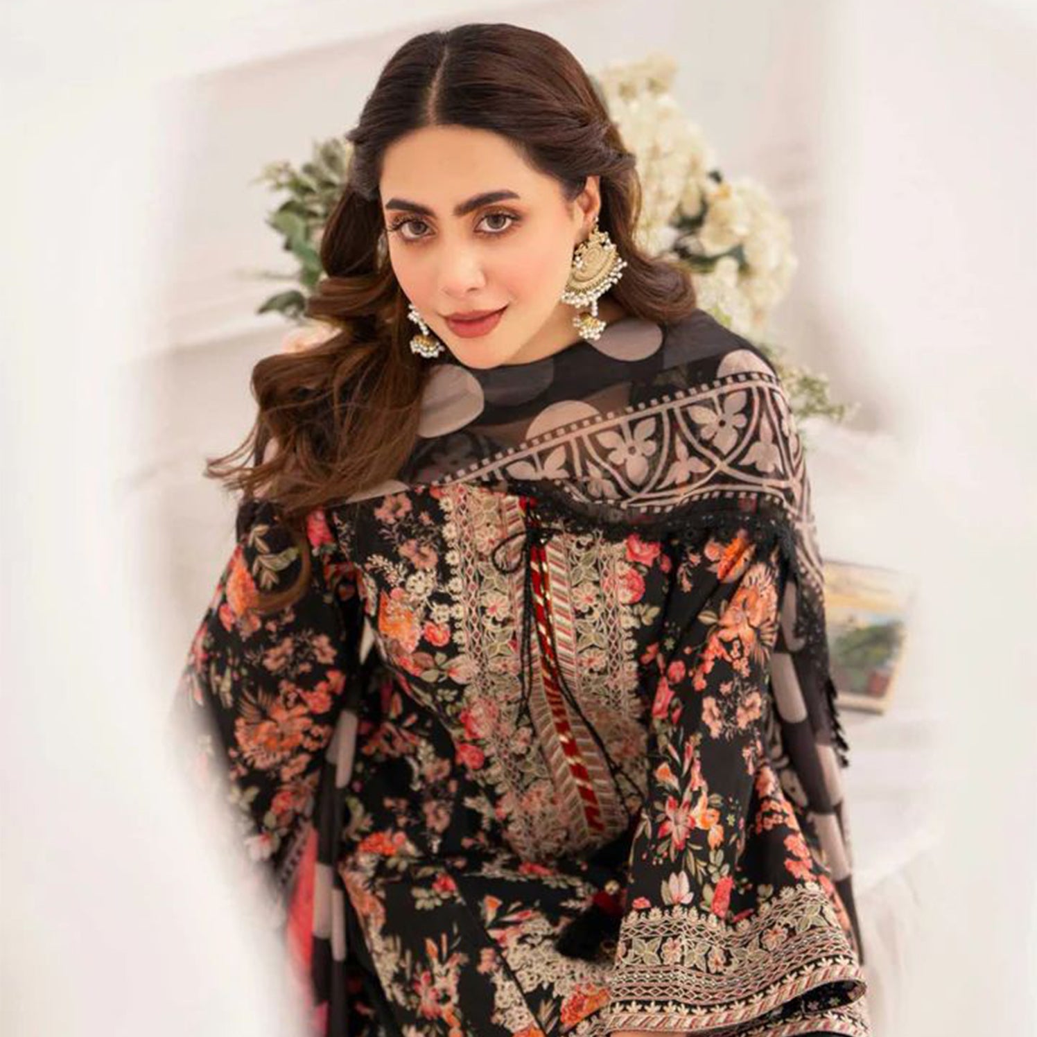 Shirt: Printed Short Shirt with Tilla and Matte Embroidery with lace work on the daman and Seleves