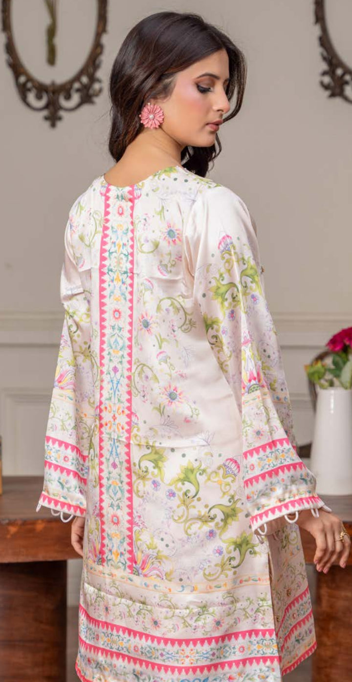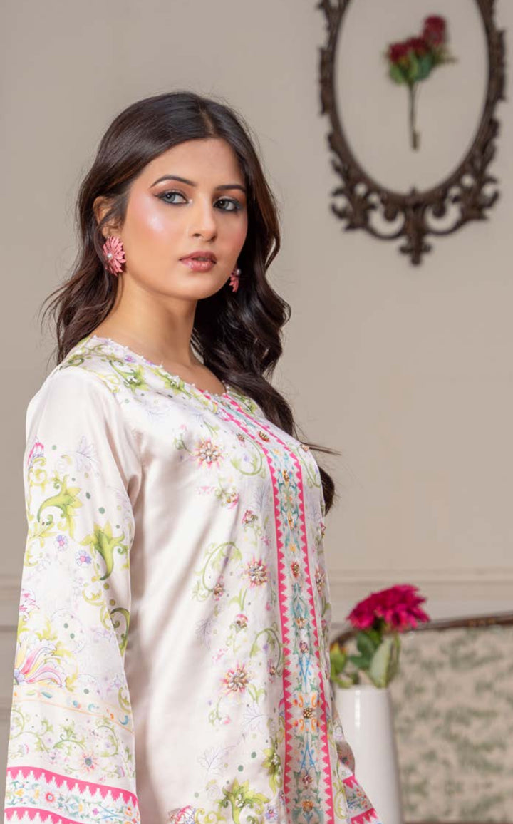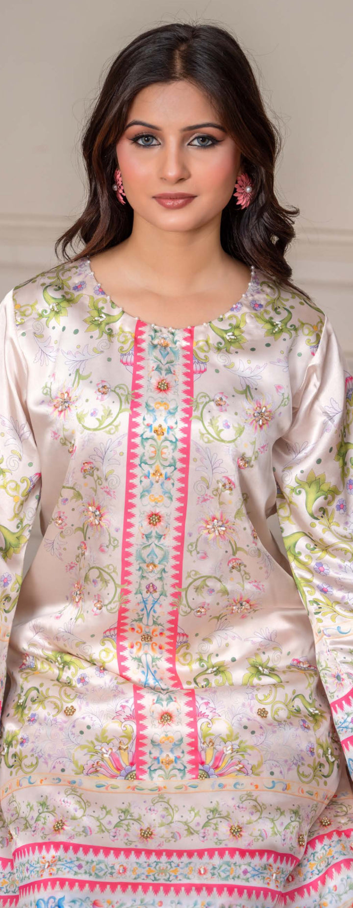 Luxury 2pc silk cream with pink and green