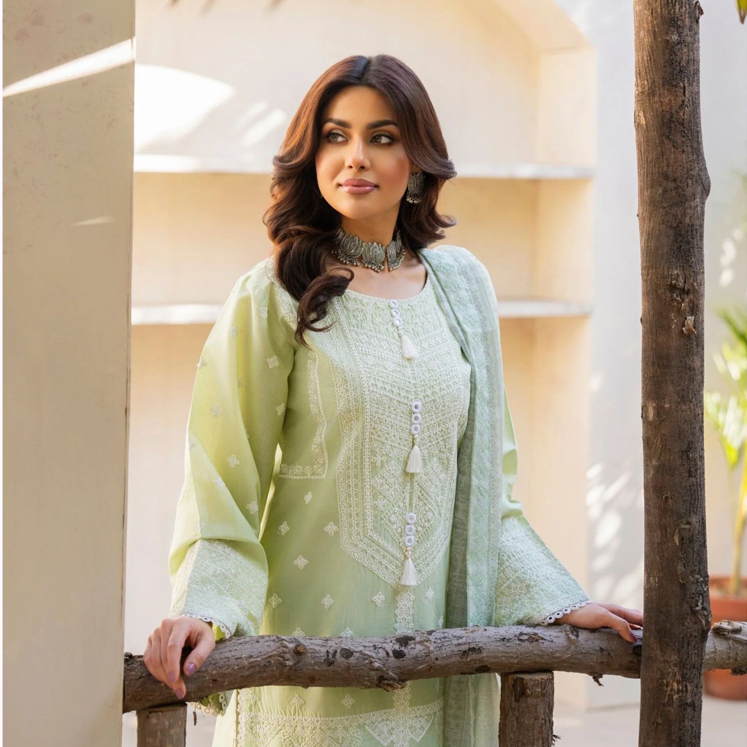 White Thread Work on the kameez with Shuttle Lace on Ghera Chaak and Mirror Work on neck line