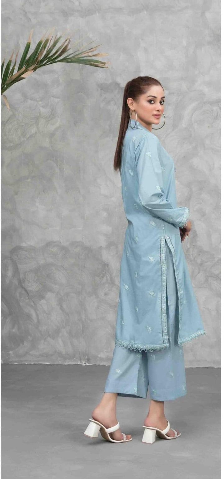 The Zuri light blue two piece set is expertly crafted with embroidered stitching, creating a unique and stylish look. This set is perfect for any occasion, adding a touch of elegance and sophistication. Made with quality materials, ensuring long-lasting wear.